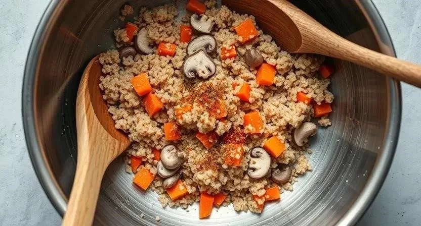 4. Смешивание ингредиентов: В большой миске соединить набухшее пшено, обжаренные овощи, яйцо, муку, соль и перец. Тщательно перемешать все ингредиенты до однородной массы.