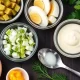 - Налейте в глубокую мисочку 500 мл сливок (жирность 10-20%), порубите полпучка зелени без толстых стеблей, взбейте венчиком 2 желтка. Всё это соедините, добавьте чайную ложку хрена, лимонную цедру для запаха, молотый перец и соль. Перемешайте ещё раз.