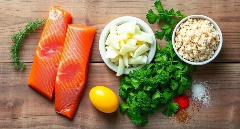 Для приготовления этих нежных котлет нам понадобится всего несколько простых ингредиентов. Я всегда стараюсь выбирать свежий лосось, это залог вкусного результата. Кстати, если нет лосося, можно использовать горбушу или треску, но вкус будет немного другим.