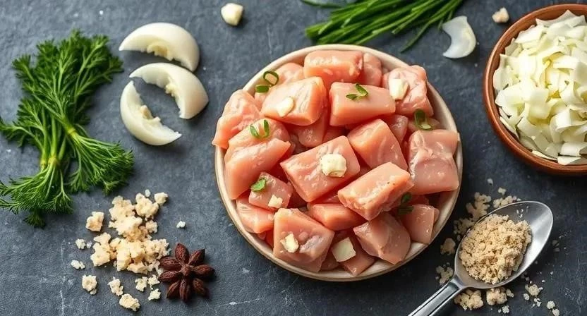 - Смешивание фарша: В миске соединить куриный фарш, чеснок, отжатый батон, яйцо, соль, перец и мелко нарезанный укроп. Тщательно перемешать до однородной массы.