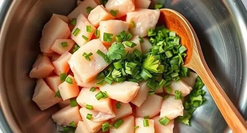 - Смешайте фарш с ингредиентами: в большой миске соедините куриный фарш, лук, чеснок, яйцо, панировочные сухари, испанские травы, соль и перец. Тщательно перемешайте до однородной массы.