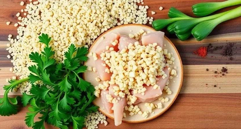 - Смешивание фарша: В большой миске соедините куриный фарш, остывшую киноа, лук, морковь, чеснок, яйцо, мелко нарезанную зелень, соль и перец. Тщательно перемешайте.