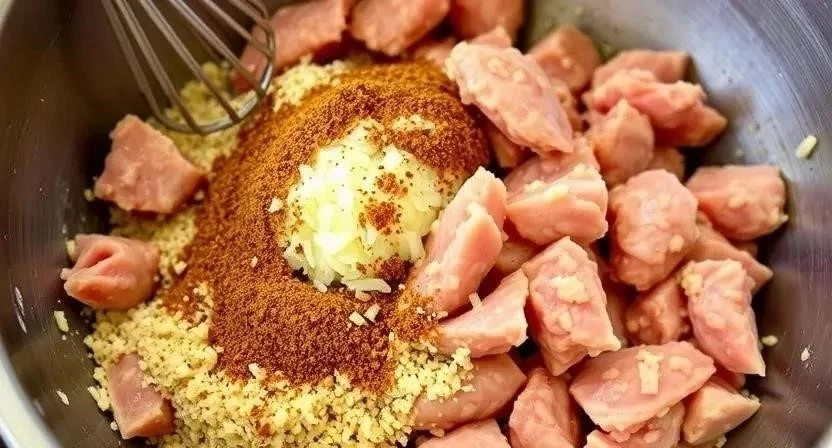 - Подготовка фарша: В глубокой миске соедините куриный фарш, манку, яйцо, мелко нарезанный лук и пропущенный через пресс чеснок. Тщательно перемешайте все ингредиенты.