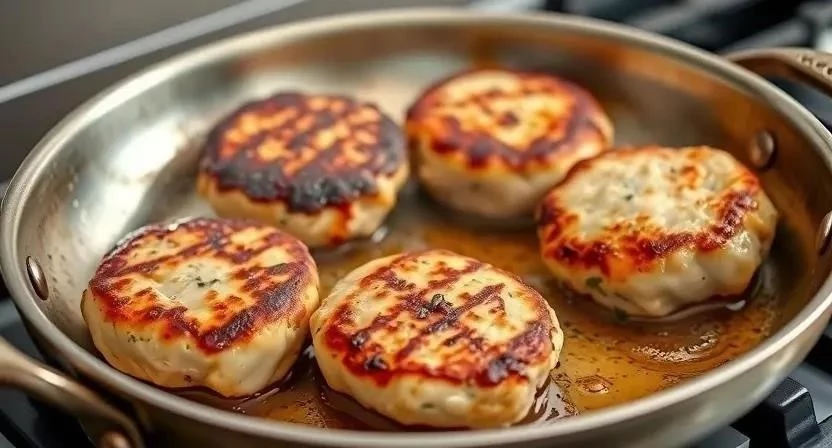 - Обжаривание: Разогрейте растительное масло в сковороде на среднем огне. Выложите котлеты на сковороду и обжаривайте с каждой стороны по 5-7 минут, до золотистой корочки.
