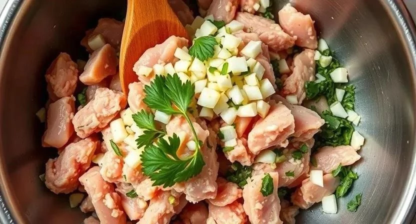 - В миске смешать куриный фарш, обжаренный лук, яйцо, мед, горчицу, соль и перец. Тщательно перемешать.