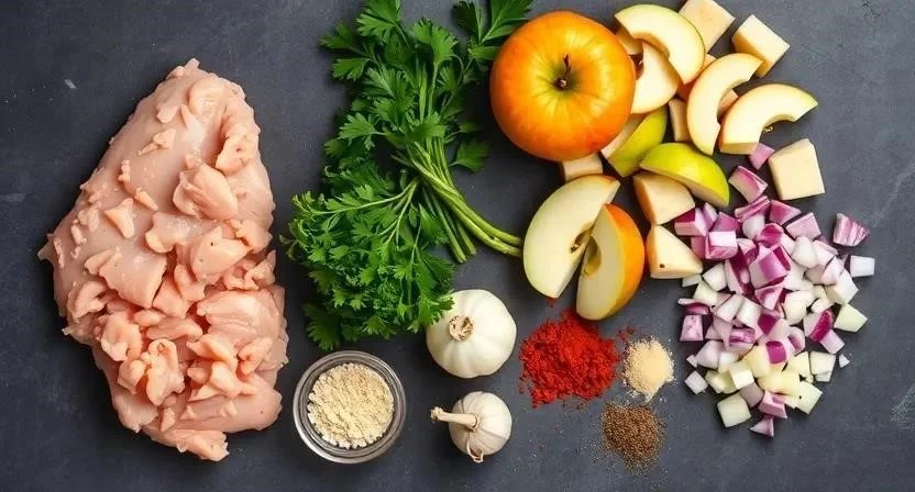 Чтобы приготовить эти восхитительные куриные котлеты с яблоком, нам понадобятся следующие ингредиенты: