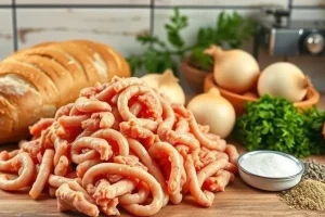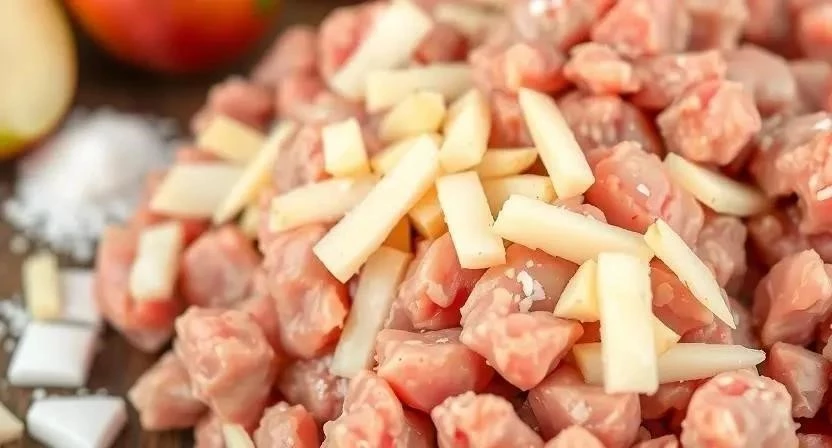 - Смешивание фарша: В глубокой миске соедините куриный фарш, тертое яблоко, лук, яйцо, панировочные сухари, соль и перец. Тщательно перемешайте все ингредиенты до однородной массы.