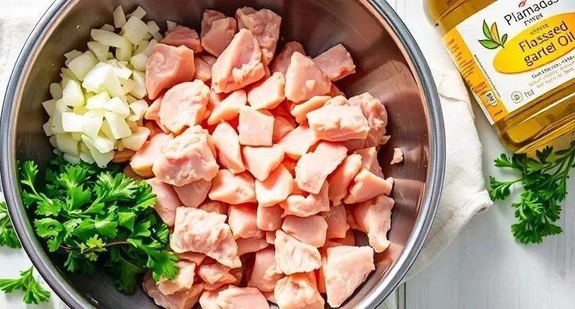 - В большой миске смешайте куриный фарш, лук, яйцо, льняное масло, соль, перец и измельченный чеснок (если используете).