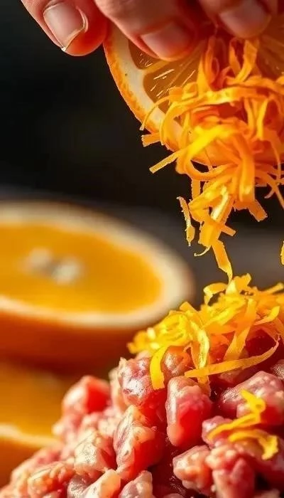 Приготовление: Смешайте фарш, натёртый апельсин (цедру и сок), измельчённый лук, яйцо, сухари, соль и перец. Сформируйте котлеты и обжарьте на сковороде до золотистой корочки.