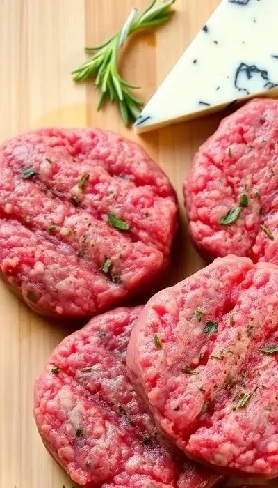 Ингредиенты: Булочки для бургеров, говяжий фарш, голубой сыр, салат, помидоры, лук, соус.
