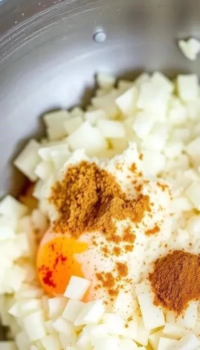 - Переложить лук в миску, добавить манную крупу, яйцо, соль, перец и паприку.