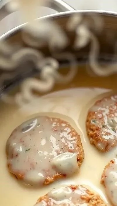 - Тушение котлет: Залейте котлеты молочным соусом и тушите под крышкой до готовности.