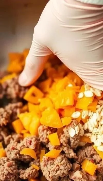 - Смешайте фарш с запечённой тыквой, овсянкой, луком, яйцом, чесноком и специями.