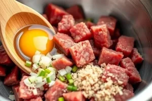 - Мясо говядины и птицы промыть, обмокнуть сухой тканью, порубить небольшими брусками. Затем сложить их в кухонный комбайн и превратить в фарш.
