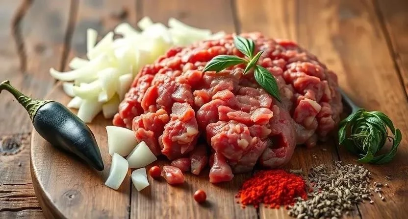 - Подготовьте фарш: смешайте говяжий фарш с мелко нарезанным луком, яйцом, панировочными сухарями, солью, перцем и мускатным орехом. Тщательно вымесите фарш, чтобы он стал однородным.