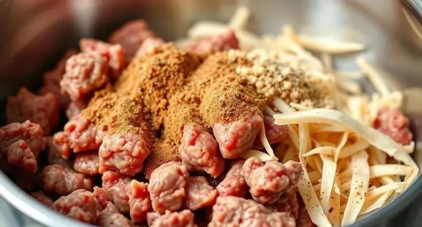 - Добавьте яйцо и специи: добавьте яйцо, соль, перец, паприку и сушеный чеснок. Тщательно перемешайте все ингредиенты.