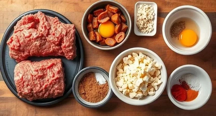 Альтернативы ингредиентам: вместо говяжьего фарша можно использовать свино-говяжий, а колбасу – заменить на бекон. Качественный фарш лучше покупать у проверенных продавцов, а хлеб – выбирать свежий, без добавок.
