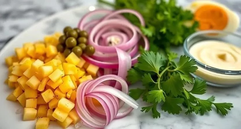 - Смешайте ингредиенты: в миске смешайте майонез, каперсы, корнишоны, лук шалот, горчицу, лимонный сок и петрушку.