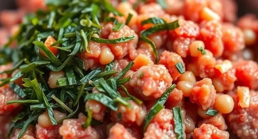 - Смешайте фарш с ингредиентами: в большой миске соедините говяжий фарш, лук, чеснок, яйцо, соевый соус, панировочные сухари, соль, перец и измельченные водоросли. Тщательно перемешайте все ингредиенты до однородной массы.