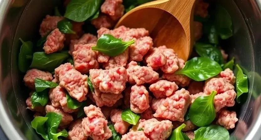 - Смешайте фарш со шпинатом, луком, чесноком, яйцом, солью и перцем.