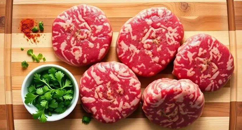 - Смешиваем фарш: В миске смешать говяжий фарш, обжаренный лук, яйцо, панировочные сухари, зиру, кориандр, соль и перец.