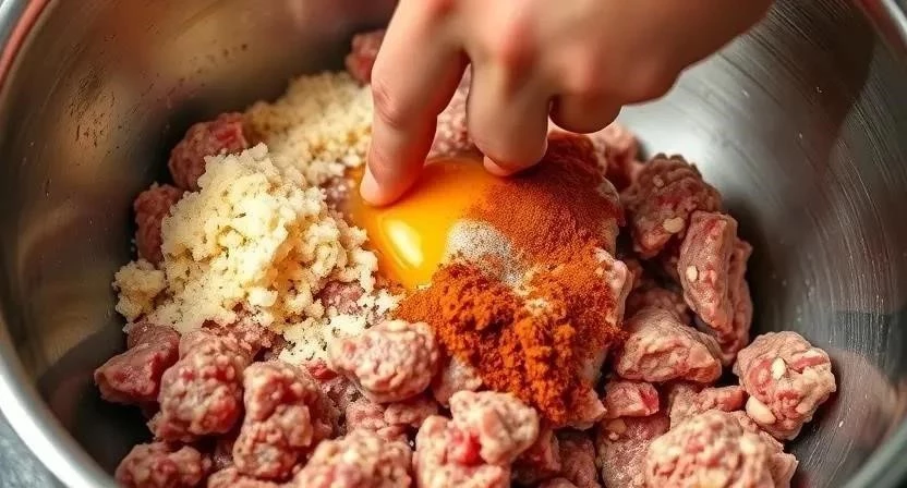 - В большой миске смешать говяжий и свиной фарш, лук, чеснок, яйцо, размягченный хлеб, соль, перец, паприку и сушеный чеснок (если используете).