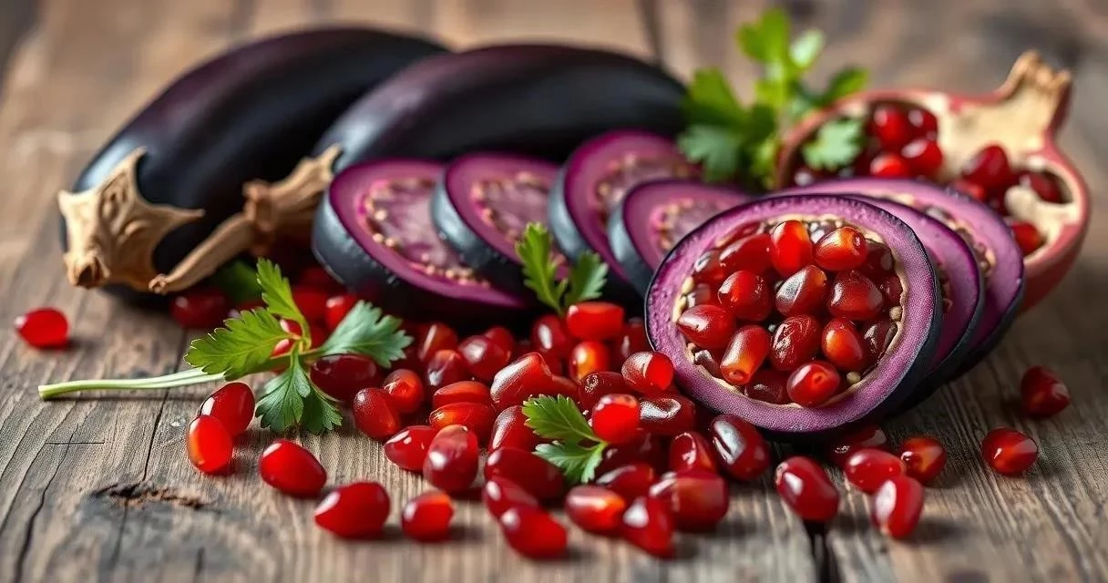 Совет: Выбирайте баклажаны с гладкой, блестящей кожурой и без повреждений. Зерна граната должны быть сочными и ярко-красными.