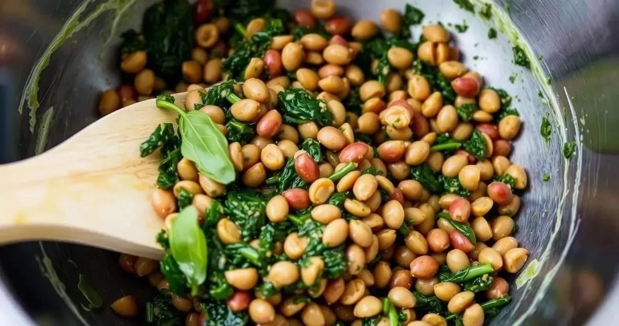 - В большой миске смешать остывшую чечевицу, шпинат, обжаренные овощи, яйцо, льняную муку, измельченный чеснок, соль, перец и специи. Тщательно перемешать.