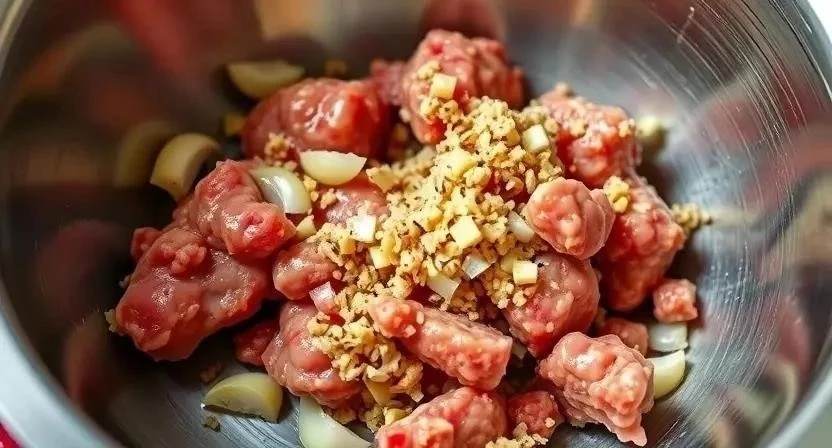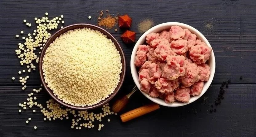 - Смешивание фарша: В большой миске соедините фарш, киноа, лук, чеснок, яйцо, панировочные сухари, соль, перец и специи. Тщательно перемешайте.
