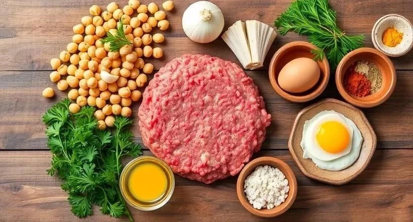- Приготовление фарша: В большой миске смешайте фарш, нут, лук, чеснок, яйцо, панировочные сухари, соль, перец и специи. Тщательно перемешайте.