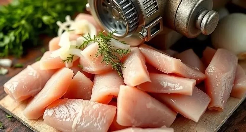 2. Приготовление фарша: Рыбное филе пропустить через мясорубку вместе с луком и салом.
