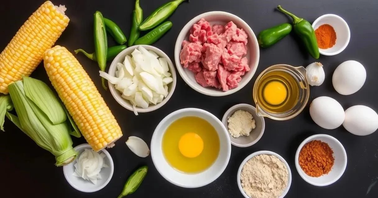 - В миске смешайте кукурузные зерна, фарш, обжаренный лук с чесноком, яйцо, панировочные сухари, мелко нарезанный халапеньо, соль и перец.