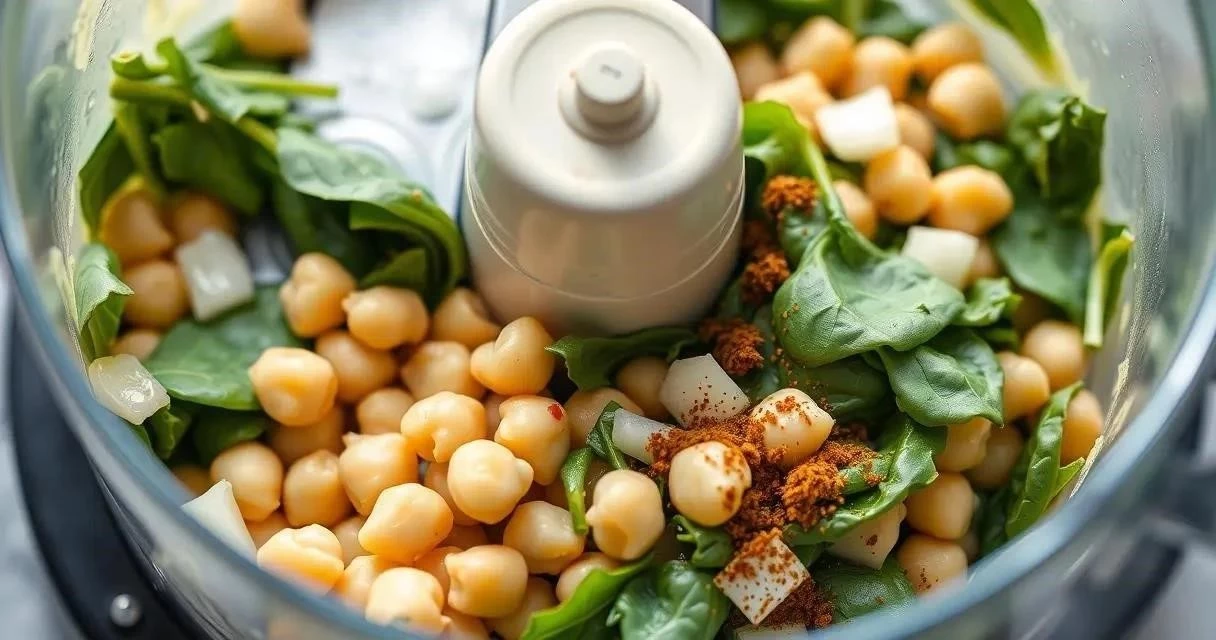 - В блендере соедините нут, шпинат, обжаренные овощи, яйцо и специи. Измельчите до однородной массы.