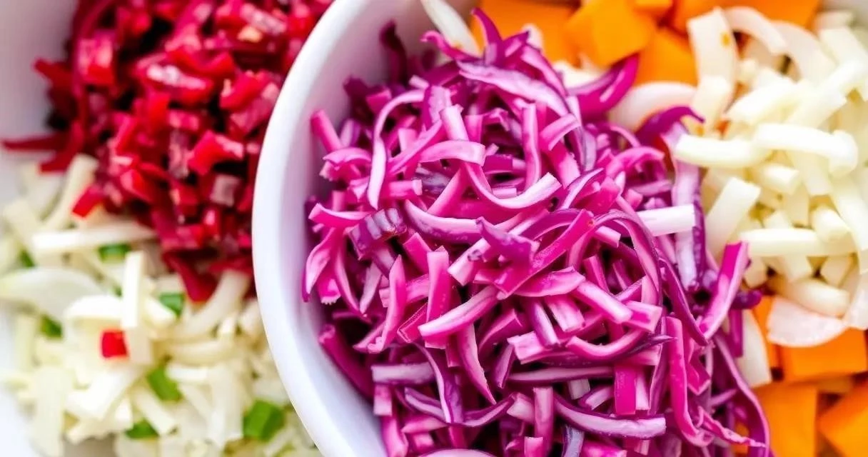- В большой миске смешать свеклу, морковь, капусту и лук.