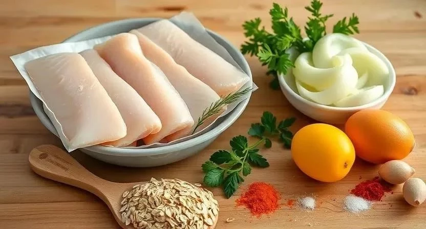 Для приготовления вкусных и сочных котлет из трески нам понадобятся следующие ингредиенты. Я всегда стараюсь выбирать свежую треску, но замороженная тоже подойдет, главное – правильно ее разморозить.