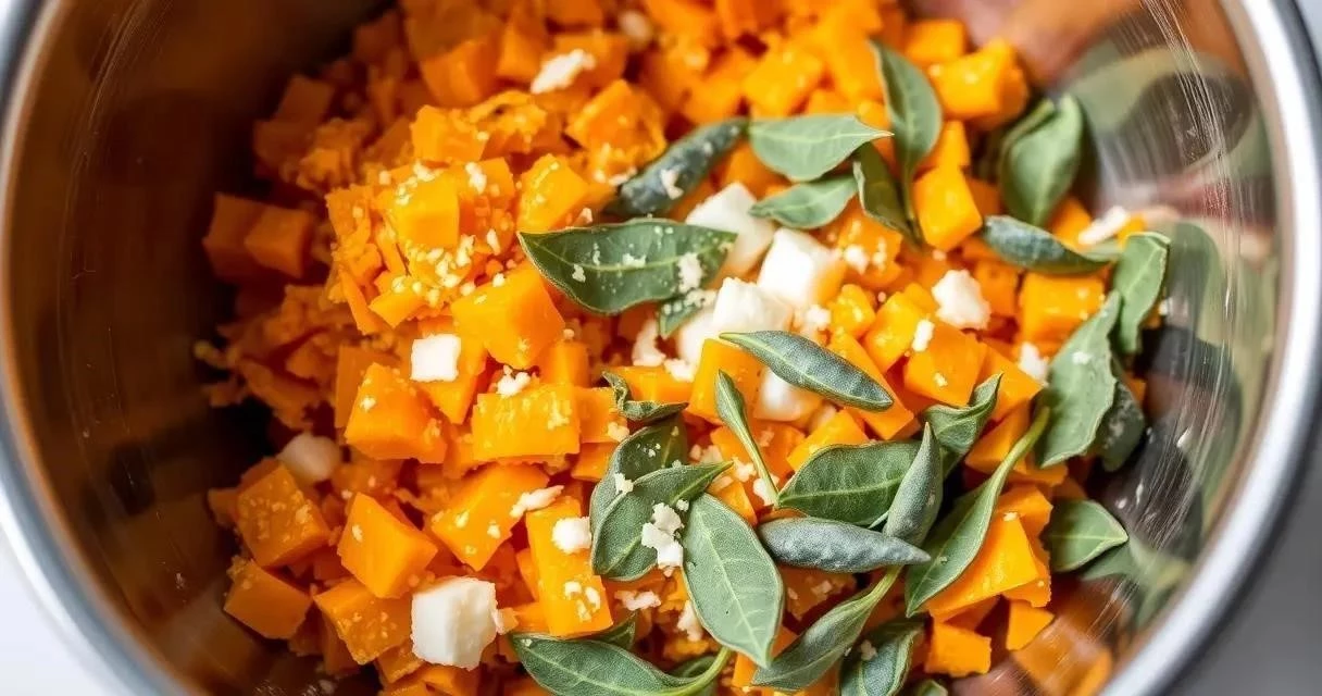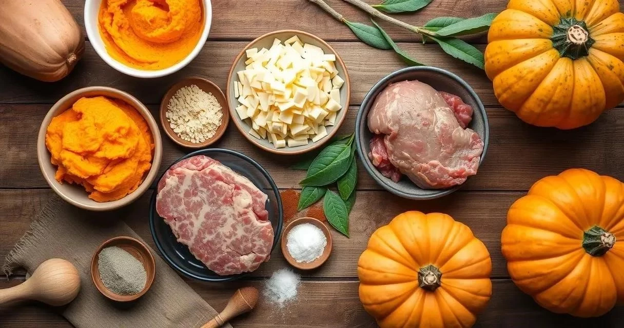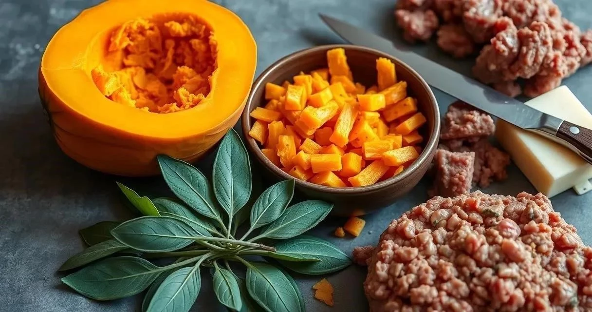 - В большой миске смешайте тыквенное пюре, фарш, тертый пармезан, нарезанный шалфей, яйцо и панировочные сухари. Посолите и поперчите по вкусу.