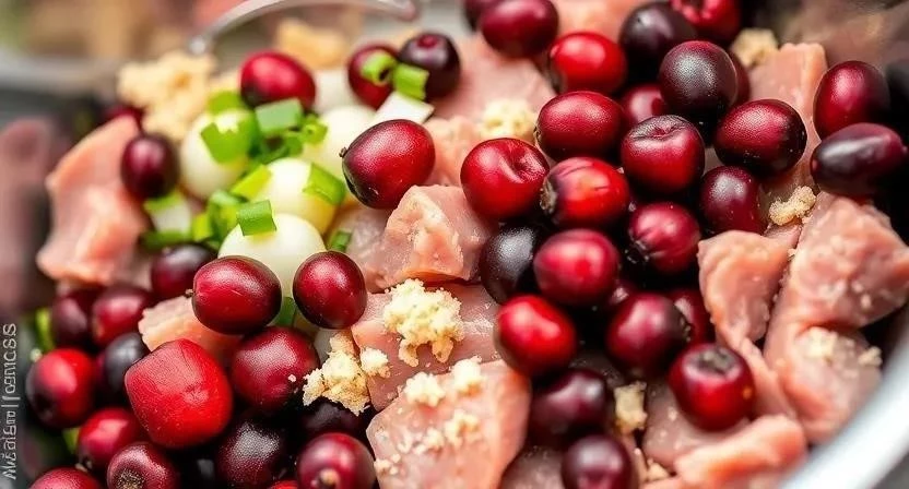 - Добавьте бруснику в фарш и аккуратно перемешайте, чтобы ягоды равномерно распределились.
