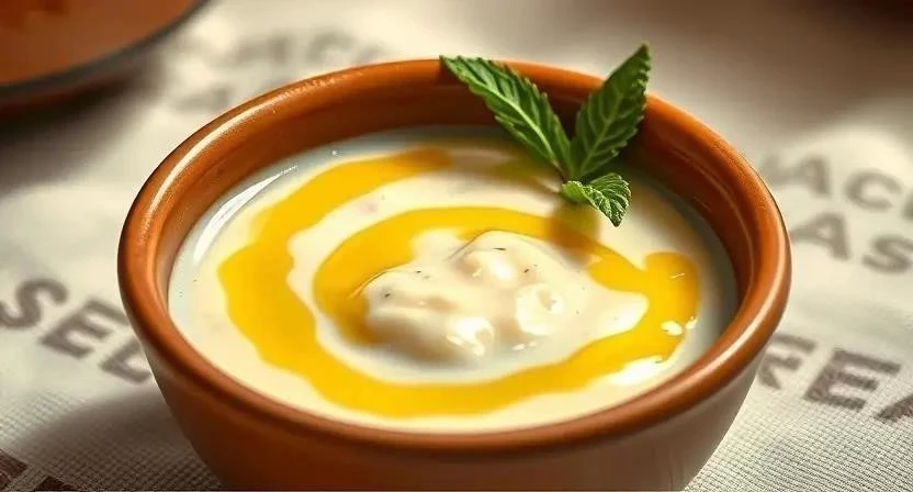 - Приготовьте соус мезе: смешайте йогурт, измельченный чеснок, натертый огурец, укроп и лимонный сок. Посолите по вкусу.