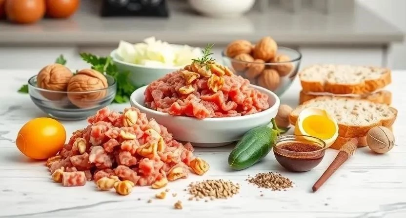 - Смешивание фарша: В большой миске смешайте фарш, размякший батон, измельченные орехи, лук, чеснок, яйцо, соль, перец и другие специи по вкусу.