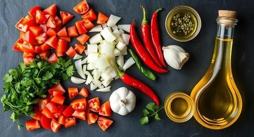 - Приготовление соуса пебре: Мелко нарежьте помидоры, лук и перец чили.