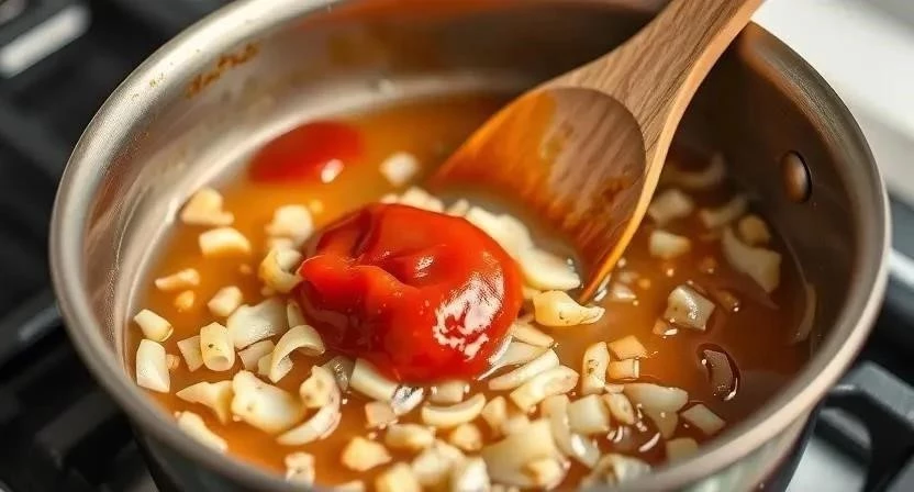- Добавление томатной пасты: Добавить томатную пасту и обжарить все вместе 1-2 минуты.