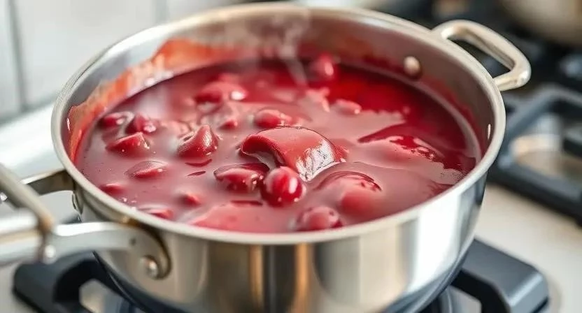 - Загустите соус: влейте крахмальный раствор в кипящую вишню, постоянно помешивая. Варите, пока соус не загустеет.