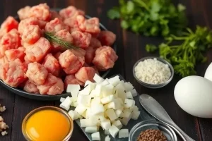 - Приготовление фарша: В миске смешать фарш, мелко нарезанный лук, измельченный чеснок, яйцо, панировочные сухари, мелко нарезанную петрушку, соль и перец. Тщательно перемешать.