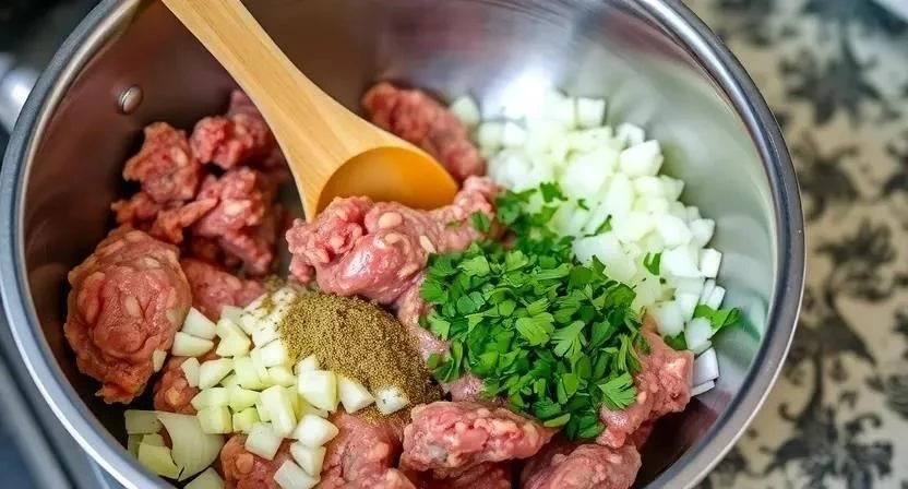 1. В большой миске смешайте фарш, лук, чеснок, яйцо, панировочные сухари, кориандр, кумин, соль и перец. Тщательно перемешайте до однородной массы.