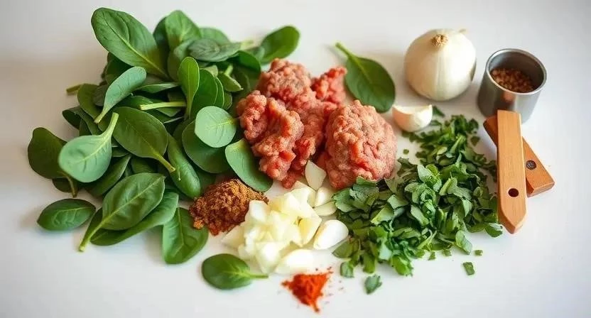 - Смешайте ингредиенты: в большой миске смешайте фарш, шпинат, лук, чеснок, яйцо и панировочные сухари. Посолите и поперчите по вкусу.