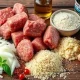 - Подготовьте фарш: смешайте свиной и куриный фарш в равных пропорциях.