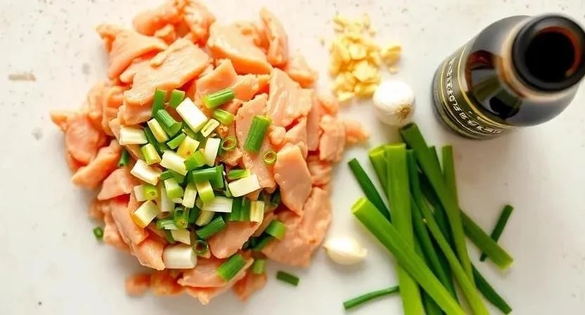 - Подготовьте фарш: смешайте его с мелко нарезанным луком, яйцом, панировочными сухарями, соевым соусом, тертым имбирем, измельченным чесноком, солью и перцем. Тщательно перемешайте.