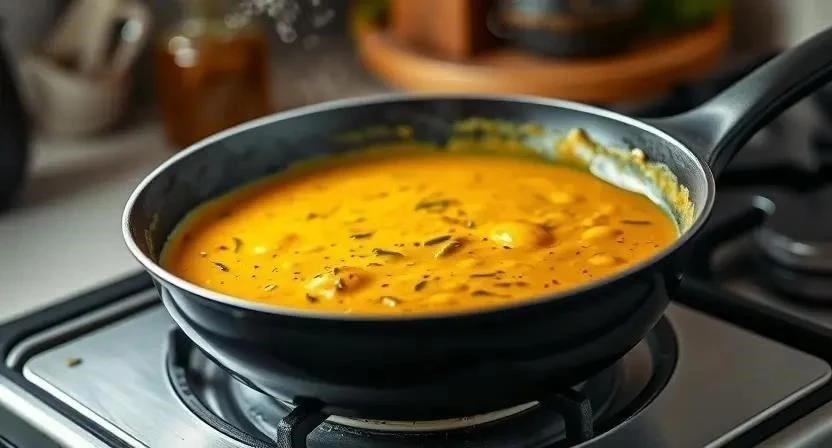 - Готовим соус: В отдельной сковороде растапливаем сливочное масло. Добавляем горчицу и мед, перемешиваем. Вливаем сливки и доводим до кипения, постоянно помешивая. Солим и перчим по вкусу.