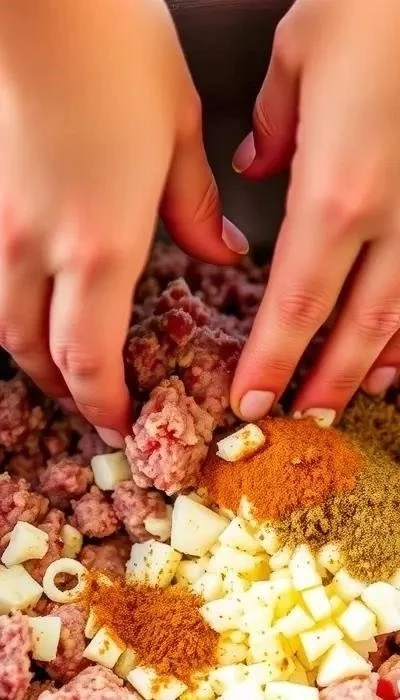 Шаг 2: Подготовка фарша и лука. Лук мелко нарежьте и обжарьте на небольшом количестве растительного масла до золотистого цвета. Смешайте фарш с обжаренным луком, яйцом, солью, перцем и специями. Тщательно перемешайте.