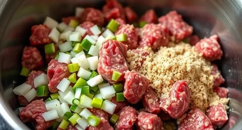 - Подготовка фарша: тщательно перемешайте фарш с луком, яйцом, хлебом (или альтернативой) и специями.